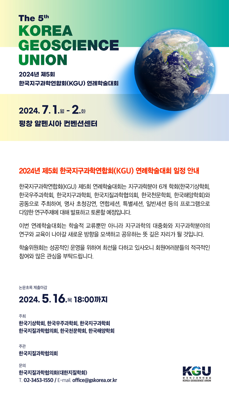 안녕하세요, 회원분들께 "2024년 제5회 한국지구과학연합회(KGU) 연례학술대회"를 아래와 같이 알려드립니다. ---------------------------------------------------------------------------------------------------------- 한국지구과학연합회(KGU) 제5회 연례학술대회는 지구과학분야 6개 학회(한국기상학회, 한국우주과학회, 한국지구과학회, 한국지질과학협의회, 한국천문학회, 한국해양학회)와 공동으로 주최하여, 명사 초청강연, 연합세션, 특별세션, 일반세션 등의 프로그램으로 다양한 연구주제에 대해 발표하고 토론할 예정입니다. 이번 연례학술대회는 학술적 교류뿐만 아니라 지구과학의 대중화와 지구과학분야의 연구와 교육이 나아갈 새로운 방향을 모색하고 공유하는 뜻 깊은 자리가 될 것입니다. 학술위원회는 성공적인 운영을 위하여 최선을 다하고 있사오니 회원여러분들의 적극적인 참여와 많은 관심을 부탁드립니다. ◆ 일   시: 2024. 7. 1.(월) ~ 7. 2.(화) ◆ 장   소: 평창 알펜시아 컨벤션센터 ◆ 논문초록 제출마감 : 2024. 5. 16.(목) 18:00까지 ◆ 주   최: 한국기상학회, 한국우주과학회, 한국지구과학회, 한국지질과학협의회, 한국천문학회, 한국해양학회 ◆ 주   관: 한국지질과학협의회 ◆ 문   의: 한국지질과학협의회(대한지질학회) Tel. 02-3453-1550 / E-mail. office@gskorea.or.kr 붙임 : 2024년 제5회 한국지구과학연합회(KGU) 연례학술대회 일정 안내문