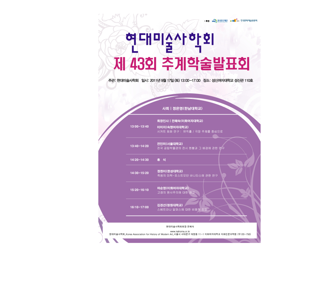 현대미술사학회에서는 제43회 추계학술발표회를 다음과 같이 개최합니다. 회원 여러분과 관심 있는 분들의 많은 참석을 바랍니다.
