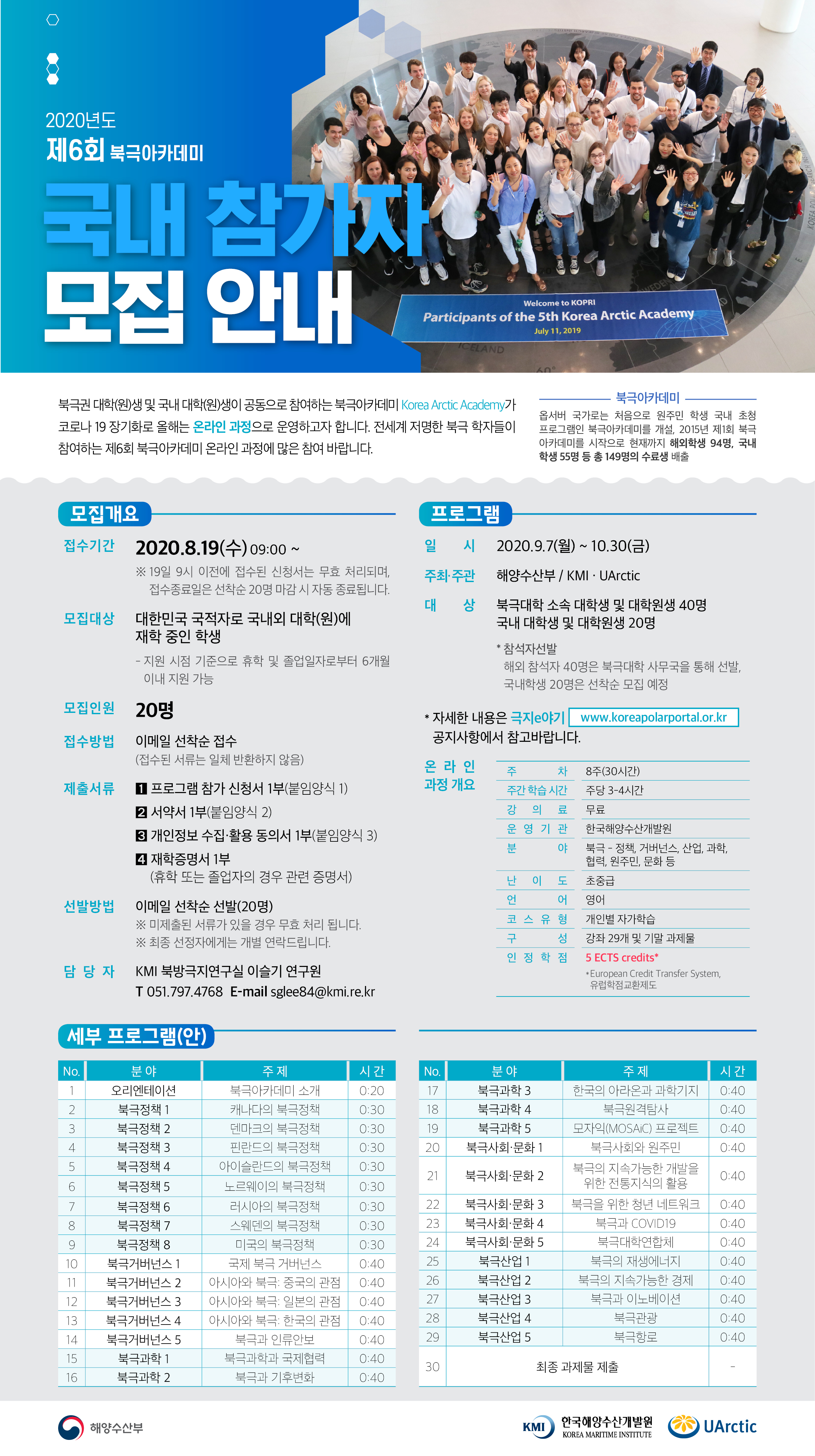 해양수산부가 주최하고 KMI 및 북극대학연합(UArctic)이 공동 주관하는 제6회 북극아카데미 국내참석자를 모집합니다.