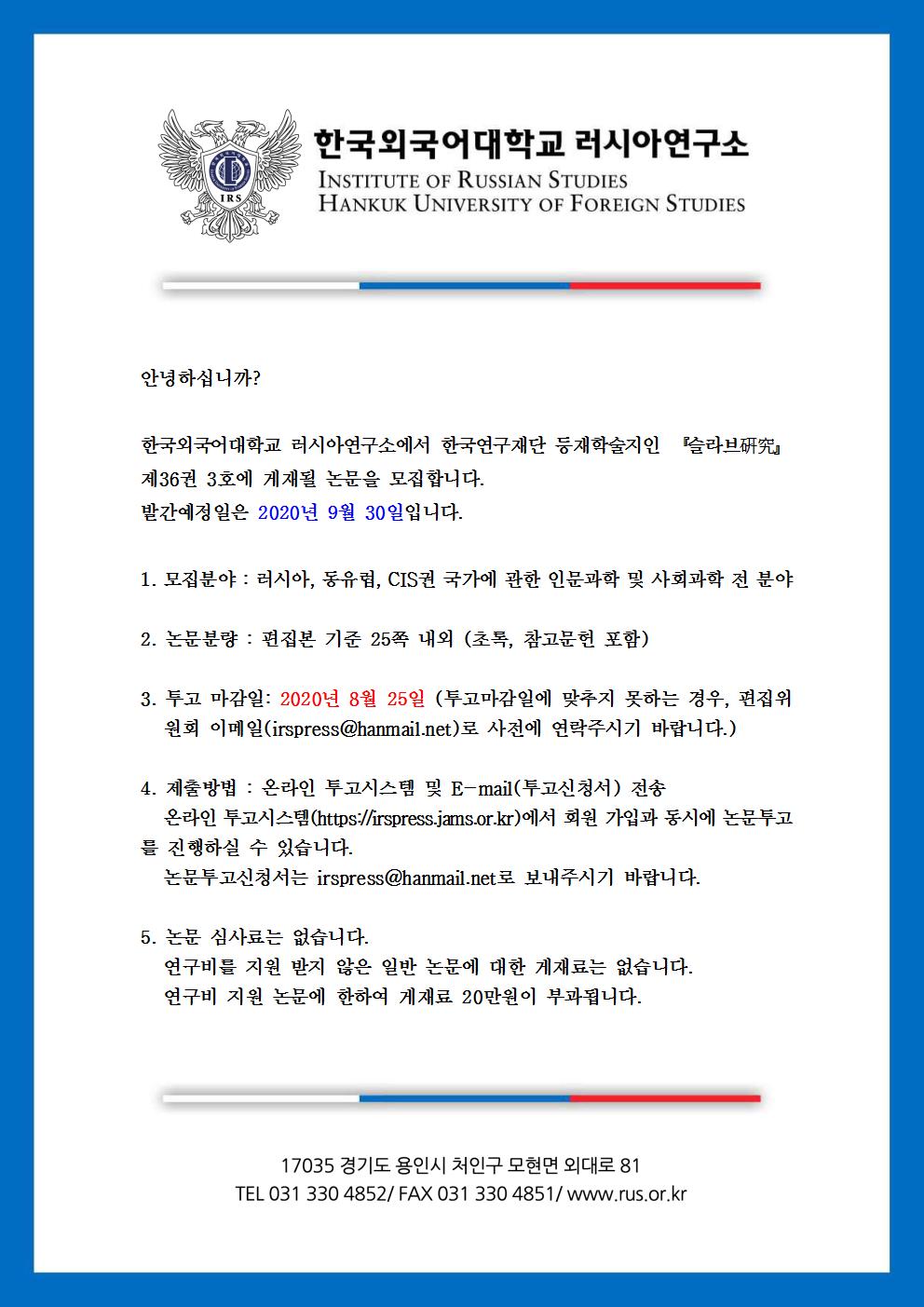 슬라브연구 제36권 3호 논문 투고 안내
