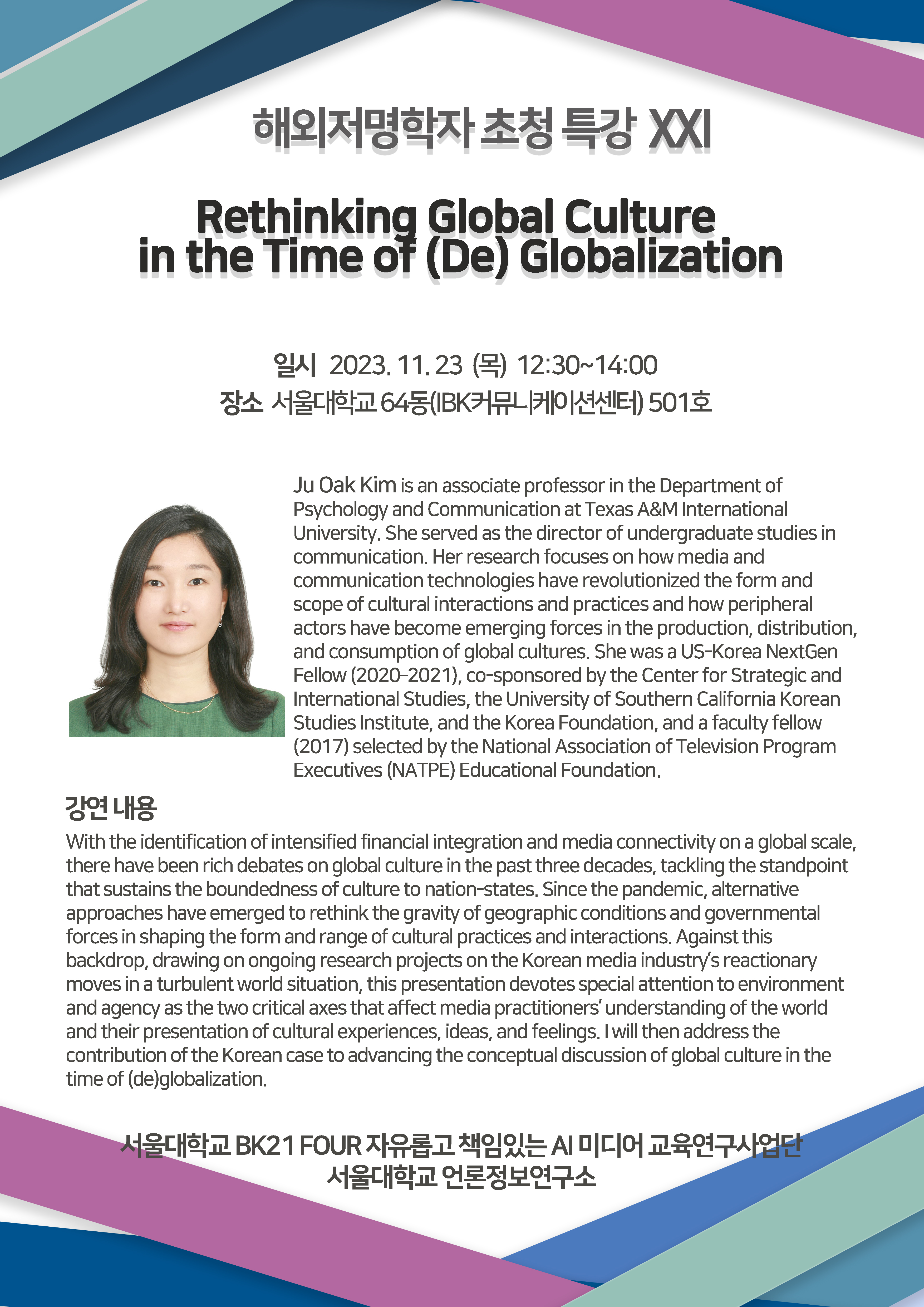 2. 서울대학교 언론정보학과 BK21 FOUR "자유롭고 책임있는 AI 미디어" 교육연구단과 언론정보연구소에서 <제21회 해외저명학자 초청 특강>을 다음과 같이 개최합니다. 회원님들의 많은 관심과 참여 바랍니다.