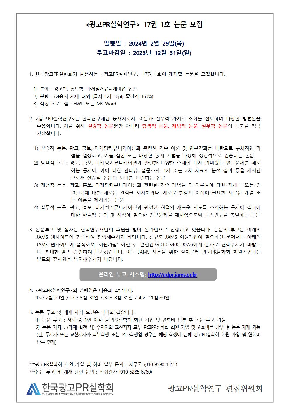 2. 한국광고PR실학회에서 <광고PR실학연구> 17권 1호 논문을 다음과 같이 모집합니다. 회원님들의 많은 관심과 참여 바랍니다.